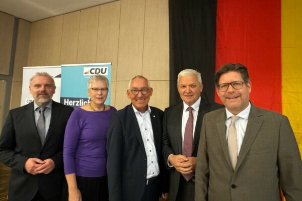 Foto: Vera Volkmann. Von links nach rechts: Stephan Wehmeier, Vorsitzender der Ost- und Mitteldeutschen Vereinigung; Dr. Bärbel Beutner, stellv. Vorsitzende im Bund der Vertriebenen; Hubert Hüppe, Bundesvorsitzender Senioren-Union; Dr. Stephan Eisel; Beatrix Wieczorek, Vorsitzende CDU Stadtverband Unna; Marco Morten Pufke, Vorsitzender CDU Kreisverband Unna.